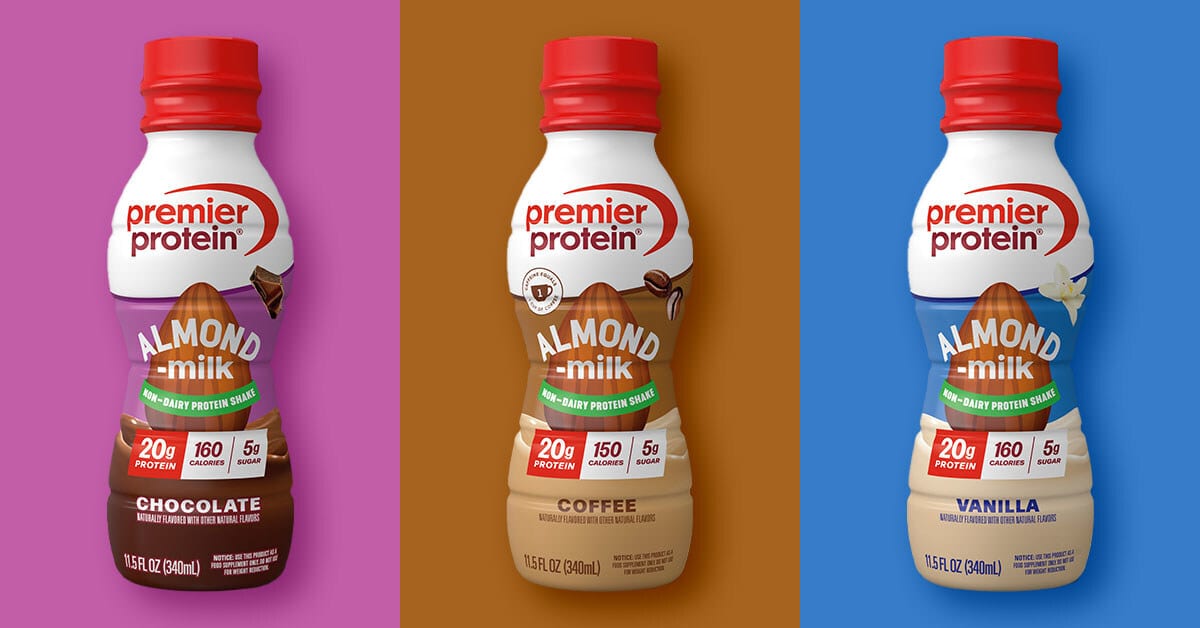 No Dairy? No Problem! Non-dairy high protein options continue to grow. New Premier Protein Almondmilk Non-Dairy Protein Shakes rely on almonds and soy protein isolate to deliver 20g of non-dairy protein, 160 calories or less, and 5g of sugar. Credit: BellRing Brands, Inc