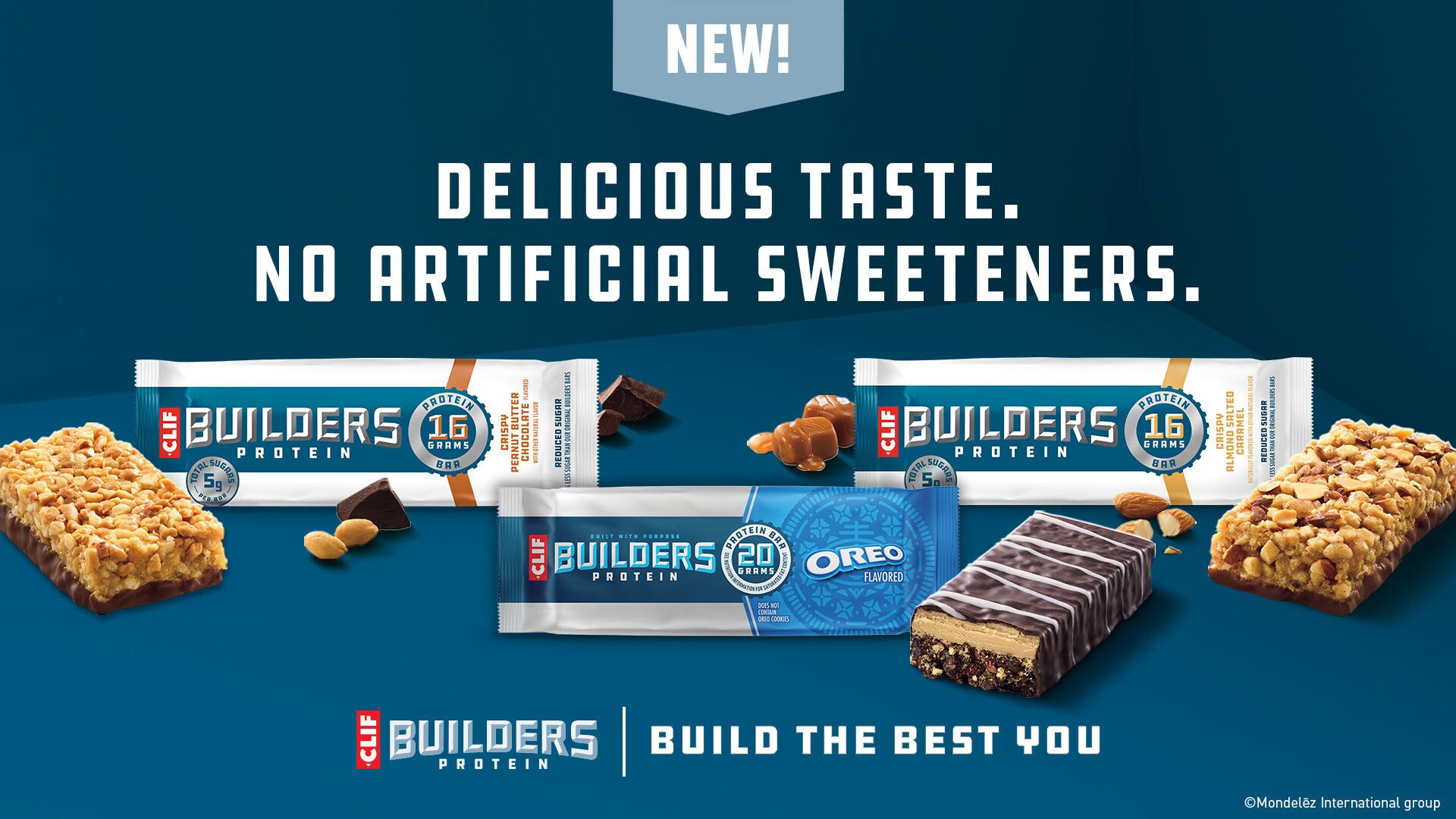 More Protein and Flavor, Less Sugar: Mondelēz extended its CLIF brand with three CLIF BUILDERS high-protein options—including a new BUILDERS OREO-flavored variety (20g of plant-based protein) and two Reduced Sugar Crispy Protein Bars (16g protein with only 5g of sugar). Credit: Mondelēz International, Inc.