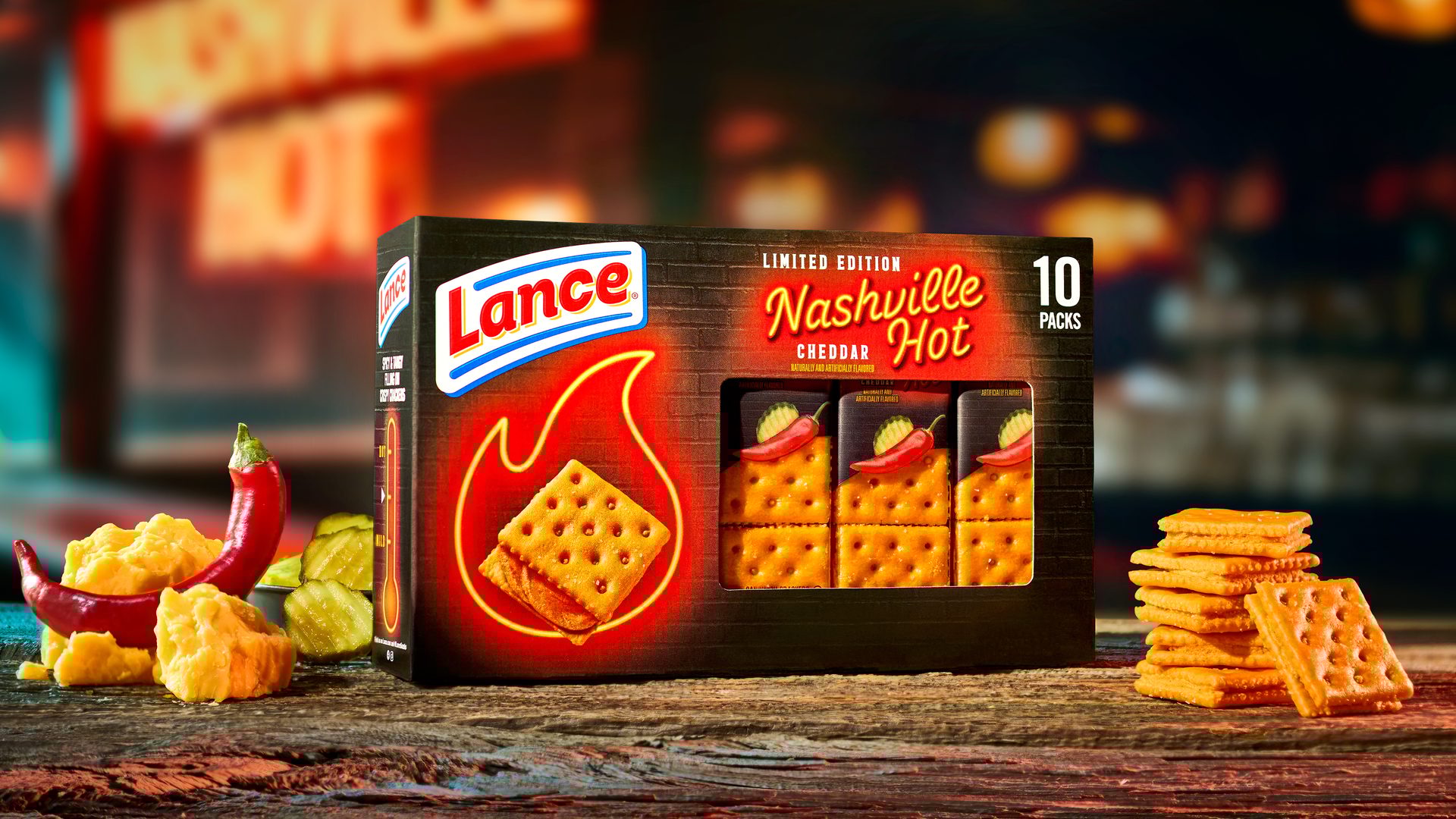 The sandwich cracker brand Lance introduced its first new flavor in nearly four years: a limited-edition Lance Nashville Hot. Lance says it features a “punch of creamy cheddar, bold heat and a dill pickle zing” in every bite between Lance’s traditional “Toast Chee” Cheddar crackers.